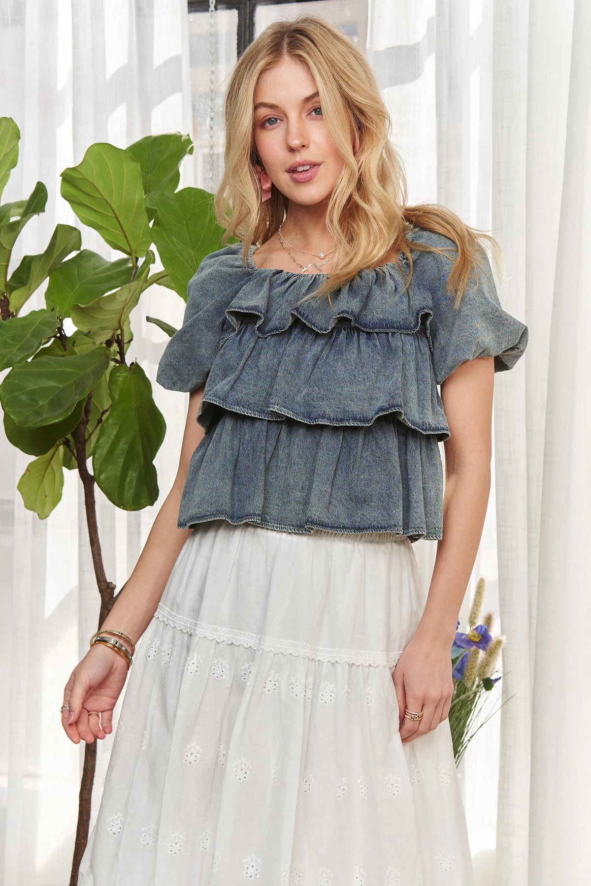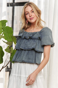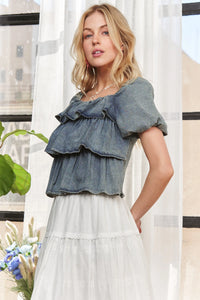 ADORA Washed Denim Layered Ruffle Blouse
