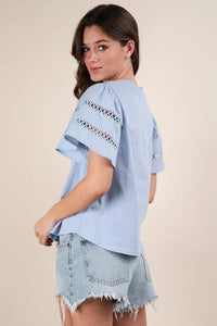 A lace trim sleeve top is a feminine and elegant piece that adds a touch of sophistication to any outfit. The delicate lace trim detailing on the sleeves gives the top a romantic and soft look, perfect for both casual and dressier occasions. This type of top can be styled in various ways - pair it with high-waisted jeans for a chic and casual look, or dress it up with a skirt or dress pants for a more polished ensemble. The lace trim adds a subtle and pretty detail to the top, making it a versatile and stylish addition to your wardrobe.