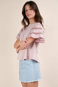A lace trim sleeve top is a feminine and elegant piece that adds a touch of sophistication to any outfit. The delicate lace trim detailing on the sleeves gives the top a romantic and soft look, perfect for both casual and dressier occasions. This type of top can be styled in various ways - pair it with high-waisted jeans for a chic and casual look, or dress it up with a skirt or dress pants for a more polished ensemble. The lace trim adds a subtle and pretty detail to the top, making it a versatile and stylish addition to your wardrobe.