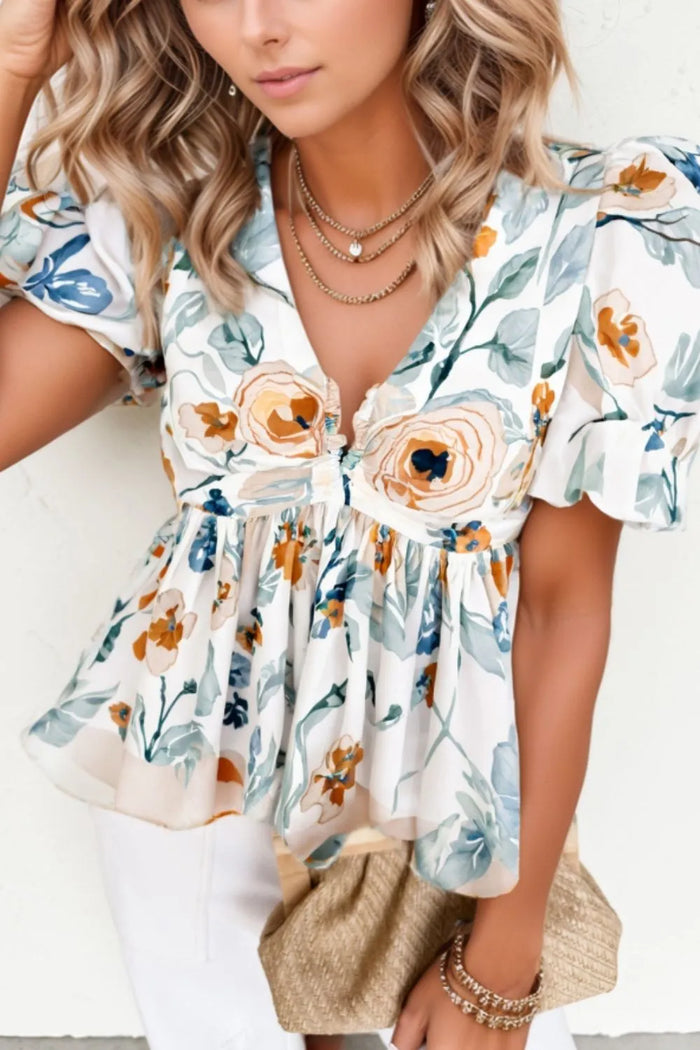 Floral Print Puff Sleeve V Neck Babydoll Blouse