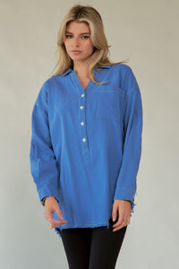Davi & Dani Letter Back Raw Hem Half Button Shirt