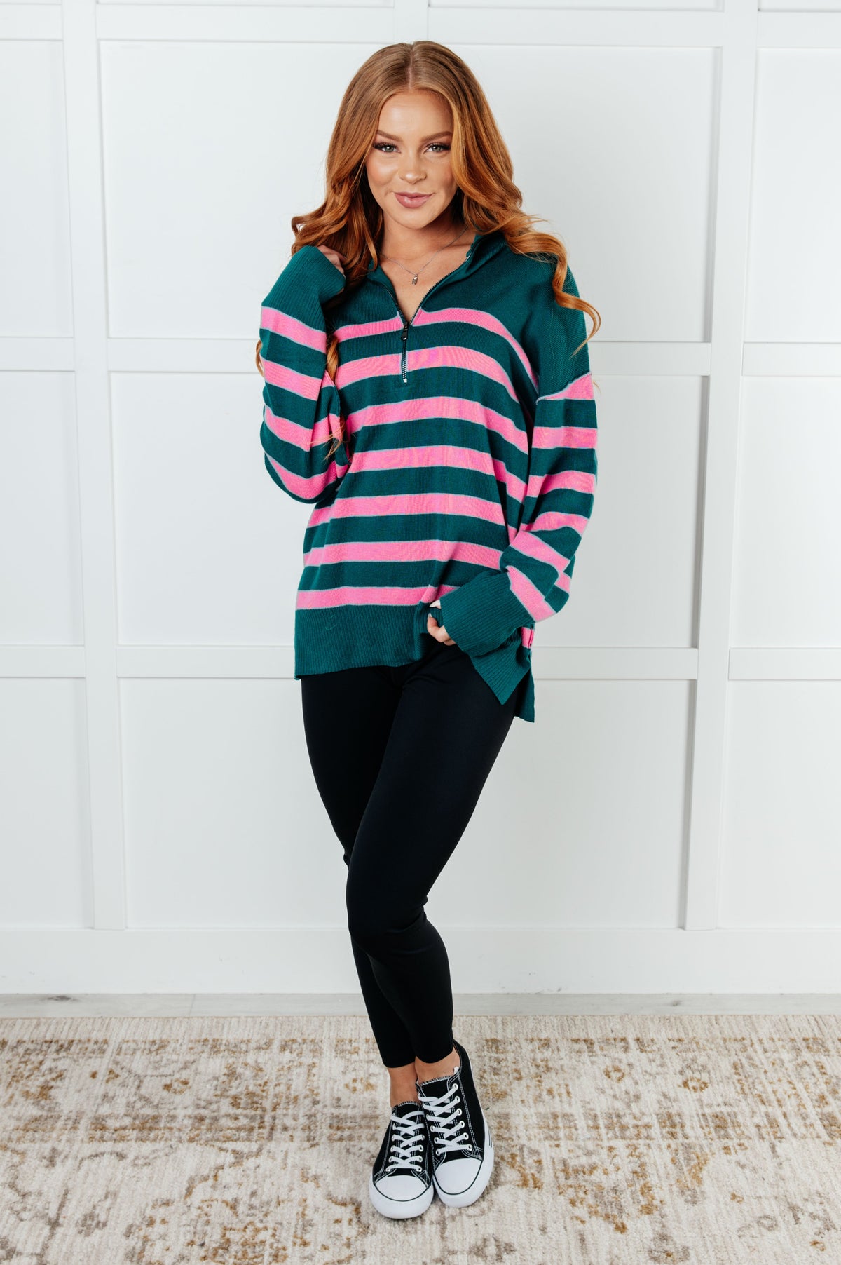Well Situated Striped Quarter Zip Sweater in Green and Pink