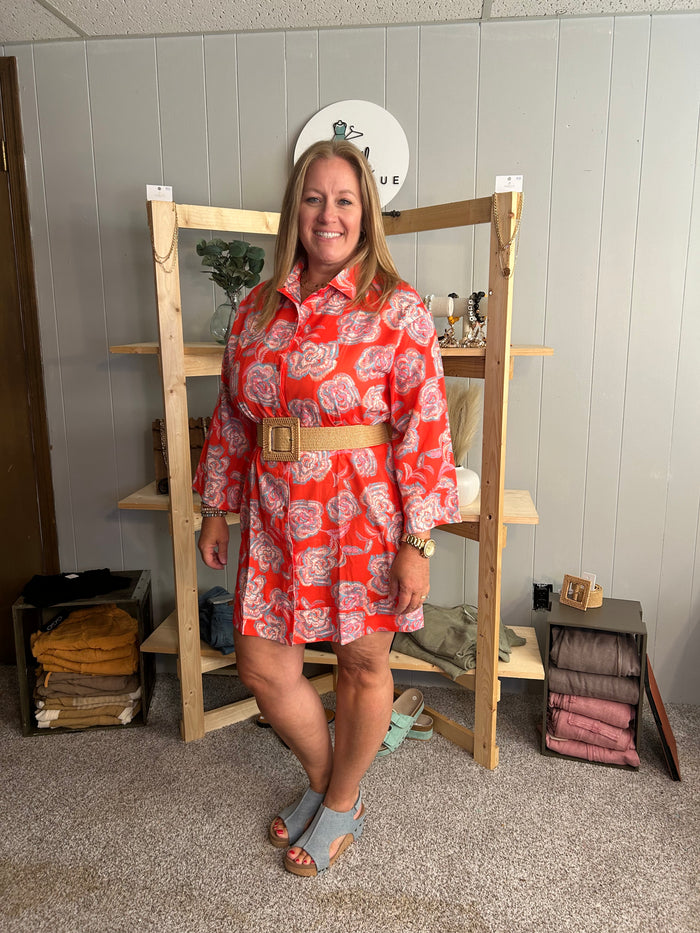 Red Floral Print Lapel Collar Loose Shirt Mini Dress