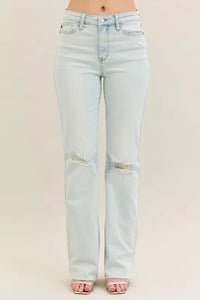 These stunning light blue high-waisted straight leg jeans feature fashion distressed detailing at the knees for an effortlessly cool look. Crafted from premium cotton denim blend, they offer comfortable stretch and durability. The high-rise waistline creates a flattering silhouette while the straight leg cut provides a timeless appeal. Perfect for casual outings or dressed up occasions, these jeans showcase carefully placed rips and fading for an authentic vintage-inspired aesthetic. The light wash denim pairs beautifully with any top, making them a versatile wardrobe essential.