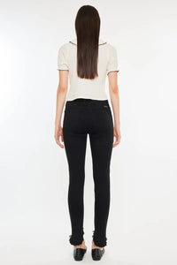 Elevate your wardrobe with these high rise black ankle skinny jeans. The high rise silhouette offers a flattering fit that accentuates your curves. Perfect for versatile styling, these jeans can be dressed up with heels or dressed down with sneakers. The ankle length adds a modern touch, making these jeans a staple piece for any wardrobe. Step out in style and confidence with these chic and timeless black skinny jeans.