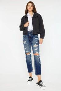 Update your denim collection with these high rise distressed mom fit jeans. The distressed detailing adds a touch of edge and personality to the classic mom jean style. The high rise design provides a flattering and comfortable fit that cinches at the waist. Pair them with a cropped top and sneakers for a casual-cool look, or dress them up with a blouse and heels for a trendy and chic outfit.